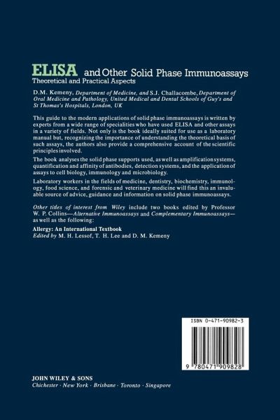 ELISA and Other Solid Phase Immunoassays Theoretical and Practical Aspects D. M. Kemeny, Department of Medicine, and S. J. Challacombe, Department of Oral Medicine and Pathology, United Medical and Dental Schools of Guy's and St Thomas's Hospitals, London, UK This guide to the modern applications of solid phase immunoassays is written by experts from a wide range of specialities who have used ELISA and other assays in a variety of fields. Not only is the book ideally suited for use as a laboratory manual but, recognizing the importance of understanding the theoretical basis of such assays, the authors also provide a comprehensive account of the scientific principles involved. The book analyses the solid phase supports used, as well as amplification systems, quantification and affinity of antibodies, detection systems, and the application of assays to cell biology, immunology and microbiology. Laboratory workers in the fields of medicine, dentistry, biochemistry, immunology, food science, and forensic and veterinary medicine will find this an invaluable source of advice, guidance and information on solid phase immunoassays. Other titles of interest from Wiley include two books edited by Professor W. P. Collins--Alternative Immunoassays and Complementary Immunoassays--as well as the following: Allergy: An International Textbook Edited by M. H. Lessof, T. H. Lee and D. M. Kemeny
