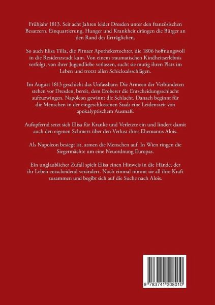 Frühjahr 1813. Seit acht Jahren leidet Dresden unter der französischen Besatzung. Einquartierung, Hunger und Krankheit drängen die Bürger an den Rand des Erträglichen. Auch die junge Elisa Tilla, die Pirnaer Apothekertochter, die 1806 hoffnungsvoll in die Residenzstadt kommt. Von einem traumatischen Kindheitserlebnis verfolgt, von ihrer Jugendliebe verlassen, sucht sie mutig ihren Platz im Leben und trotzt allen Schicksalsschlägen.Doch im August 1813 geschieht das Unfassbare: Die Armeen der Verbündeten stehen vor Dresden, bereit, dem Eroberer die Entscheidungsschlacht aufzuzwingen. Napoleon gewinnt die Schlacht. Danach beginnt für die Menschen in der eingeschlossenen Stadt eine Leidenszeit von apokalyptischem Ausmaß.Elisa hilft, wo sie kann. Bis zur Selbstzerstörung setzt sie sich für Kranke und Verletzte ein. Lindert so den Schmerz über den vermeintlichen Tod ihres Ehemanns Alois.Als Napoleon in der Schlacht bei Leipzig geschlagen wird, atmen die Völker auf. In Wien ringen die Siegermächte um eine Neuordnung Europas. Für seine Treue zu Napoleon wird das Königreich Sachsen empfindlich bestraft.Elisa beginnt am Tod ihres Mannes zu zweifeln, als ihr der Zufall plötzlich einen Hinweis in die Hände spielt. Noch einmal nimmt sie all ihre Kraft zusammen und beschließt Alois zu suchen.
