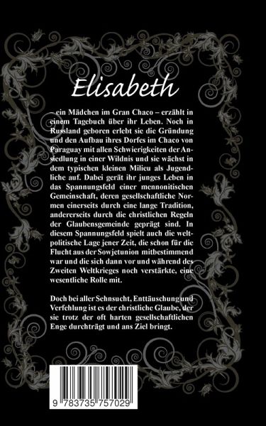 Elisabeth - Aus dem Tagebuch eines mennonitischenMädchens im Gran Chaco - ist ein Roman. Inhalte, dieeinem so begrenzten Raum, wie dem einer Mennonitenkolonieim paraguayischen Chaco entnommen werden,verleiten schnell dazu, Personen und Handlungen identifizierenzu wollen.Das Ansinnen wäre müßig, denn keine der hier dargestelltenPersonen hat es so wirklich gegeben und auchdas Dorf ist fingiert. Doch viele Bruchstücke, die auf ihremHintergrund einer Wirklichkeit entsprechen, sind hier zueinem geschlossenen Ganzen zusammengefügt worden,um so ein Menschenleben in einer ganz besonderen Gemeinschaft und in einer ganz besonderen Umwelt darzustellen.Damit wird der ganze Ablauf des kurzen Lebensvon Elisabeth auf seine Weise dann wieder Realität.Elisabeth Unruh blüht in der ihr zugemessenen Zeitspanneunter den religiösen, sozialen und politischenVerhältnissen ihrer Gemeinschaft, ihrer Gemeinde undder Weltlage auf, blüht und verblüht, wie die Königin derNacht im Chacobusch. Das Leben eines mennonitischenMädchens in einer mennonitischen Gesellschaft, verzahntmit dem Weltgeschehen, das ist der reale Hintergrunddieses Romans. Elisabeth wächst in dem Spannungsfeldeiner Jahrhunderte alten gesellschaftlichen Tradition, dievon den religiösen Normen der christlichen Gemeinde mit geformt ist, auf. Sie ist ihr ausgesetzt und ihr junges Lebenwird davon bestimmt. Doch es ist bei allen Konflikten derchristliche Glaube, der sie durchträgt und ans Ziel bringt.Die Tagebuchform soll diesem Leben die Unmittelbarkeitverleihen.Dem Verein für Geschichte und Kultur der Mennonitenin Paraguay ist zu danken, dass er die Herausgabe diesesBuches, dessen Manuskript schon einige Zeit vorliegt,ermöglichte.