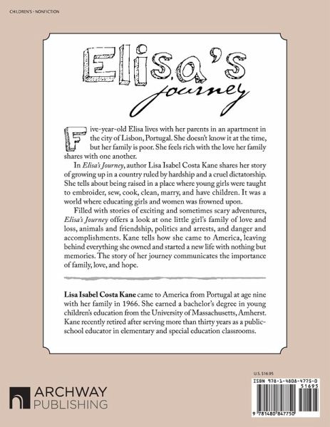 Five-year-old Elisa lives with her parents in an apartment in the city of Lisbon, Portugal. She doesn't know it at the time, but her family is poor. She feels rich with the love her family shares with one another. In Elisa's Journey, author Lisa Isabel Costa Kane shares her story of growing up in a country ruled by hardship and a cruel dictatorship. She tells about being raised in a place where young girls were taught to embroider, sew, cook, clean, marry, and have children. It was a world where educating girls and women was frowned upon. Filled with stories of exciting and sometimes scary adventures, Elisa's Journey offers a look at one little girl's family of love and loss, animals and friendship, politics and arrests, and danger and accomplishments. Kane tells how she came to America, leaving behind everything she owned and started a new life with nothing but memories. The story of her journey communicates the importance of family, love, and hope.