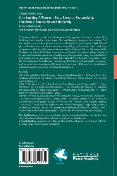 Part I: Biographical Information - Bibliography.- Tributes and Remembrances by Scholars and Activists on Elise Boulding; Bibliography of Writings about Elise Boulding).- Part II: Writings by Elise Boulding on Peace Research and Peacemaking.- Peace Research: The New Intellectual Frontier (1963).- The Dialectics of Peace (1990).- Feminist Inventions in the Art of Peacemaking (1995).- Peace Culture: An Overview (2000)-Reflections on Activism in One's Eighties (2001).- Part III: Writings by Elise Boulding on the Family, the Future, Feminism and Quakerism.- The Family as an Agent of Social Change (1972).- Translator's Preface to The Image of the Future by Fred Polak (1973).