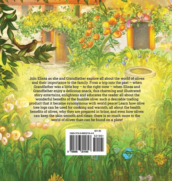 Elissa, protagonist of Elissa Uncovers the Origins of the Alphabet, returns in this charming and beautifully illustrated book. She is, once again, traveling back in time, but this time, she is only going as far as her Grandfather's youth to uncover the origins of his love for olive trees. Grandfather explains that olive trees look beautiful, the logs can make fragrant long-lasting firewood for warmth and cooking, that olives and olive oil taste delicious (which Elissa already knows!) and that olive oil can even be made into soap or lotion. Not only that, but the small fruits have healing properties, keeping hearts healthy and bones strong. More than that: looking after olive trees makes Grandfather feel closer to his own grandfather, and his great-grandfather and his great-great-grandfather... It is no wonder that an olive branch has become a symbol for world peace, says Grandfather, because everyone in the world loves olives! Join Elissa and Grandfather in this informative and amusing book that is ideal for the home's bookshelves, the classroom, or for inclusion in the children's section of a lending library. Parents and children alike, will love the simple storyline, the warm familial bonds depicted in the tale and the clear and beautiful illustrations. It is sure to be a firm favorite, whether as a bedtime story or some quiet reading time after all the chores have been done!