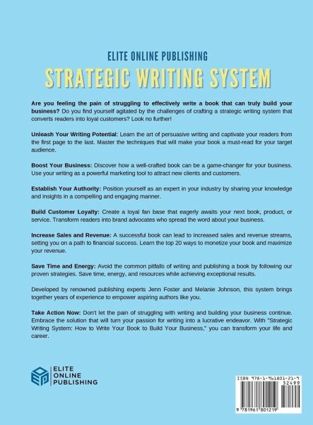 Are you feeling the pain of struggling to effectively write a book that can truly build your business? Do you find yourself agitated by the challenges of crafting a strategic writing system that converts readers into loyal customers? Look no further! Our comprehensive book, "Strategic Writing System: How to Write Your Book to Build Your Business," is the ultimate solution you've been searching for. In this powerful guide, we reveal the secrets of creating a book that not only showcases your expertise but also drives growth for your business. Say goodbye to the frustration of poorly written books that fail to resonate with your audience. This book is designed to transform your writing skills and elevate your brand to new heights. Benefits of Having This Book: Unleash Your Writing Potential: Learn the art of persuasive writing and captivate your readers from the first page to the last. Master the techniques that will make your book a must-read for your target audience. Boost Your Business: Discover how a well-crafted book can be a game-changer for your business. Use your writing as a powerful marketing tool to attract new clients and customers. Establish Your Authority: Position yourself as an expert in your industry by sharing your knowledge and insights in a compelling and engaging manner. Build Customer Loyalty: Create a loyal fan base that eagerly awaits your next book, product, or service. Transform readers into brand advocates who spread the word about your business. Increase Sales and Revenue: A successful book can lead to increased sales and revenue streams, setting you on a path to financial success. Learn the top 20 ways to monetize your book and maximize your revenue. Save Time and Energy: Avoid the common pitfalls of writing and publishing a book by following our proven strategies. Save time, energy, and resources while achieving exceptional results. What You'll Gain:- An in-depth understanding of the key components that make a book successful. - Step-by-step guidance on crafting a compelling storyline and engaging narrative. - Strategies to identify and connect with your target audience on a profound level. - Techniques to promote and market your book effectively for maximum impact. - Get inspired with 21 motivational quotes to ignite your marketing genius. - Developed by renowned publishing experts Jenn Foster and Melanie Johnson, this system brings together years of experience to empower aspiring authors like you. Take Action Now. Don't let the pain of struggling with writing and building your business continue. Embrace the solution that will turn your passion for writing into a lucrative endeavor. With "Strategic Writing System: How to Write Your Book to Build Your Business," you can transform your life and career.