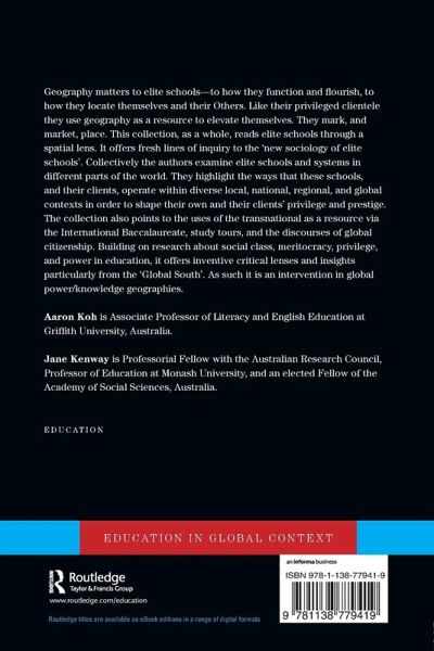 Geography matters to elite schools - to how they function and flourish, to how they locate themselves and their Others. Like their privileged clientele they use geography as a resource to elevate themselves. They mark, and market, place. This collection, as a whole, reads elite schools through a spatial lens. It offers fresh lines of inquiry to the 'new sociology of elite schools.' Collectively the authors examine elite schools and systems in different parts of the world. They highlight the ways that these schools, and their clients, operate within diverse local, national, regional, and global contexts in order to shape their own and their clients' privilege and prestige. The collection also points to the uses of the transnational as a resource via the International Baccalaureate, study tours, and the discourses of global citizenship. Building on research about social class, meritocracy, privilege, and power in education, it offers inventive critical lenses and insights particularly from the 'Global South.' As such it is an intervention in global power/knowledge geographies.