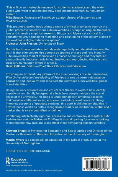'This compelling book reveals the commanding imprint of elite power on the workings of Britain's most famous universities. Bhopal and Myers quote numerous revealing accounts from students whose feelings are all too clearly marked by this experience. This will be an invaluable resource for students, academics and the wider public who want to understand how deep inequalities mark our education system.'