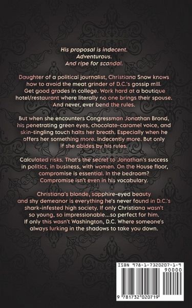 "A compelling love story with real emotion...and the right amount of fantasy." ~Joey W. Hill, award-winning author and recipient of the RT Book Reviews Career Achievement Award. His proposal is indecent. Adventurous. And ripe for scandal. Daughter of a political journalist, Christiana Snow knows how to avoid the meat grinder of D.C.'s gossip mill. Get good grades in college. Work hard at a boutique hotel/restaurant where literally no one brings their spouse. And never, ever bend the rules. But when she encounters Congressman Jonathan Brond, his penetrating green eyes, chocolate-caramel voice, and skin-tingling touch halts her breath. Especially when he offers her something more. Indecently more. But only if she abides by his rules. Calculated risks. That's the secret to Jonathan's success in politics, in business, with women. On the House floor, compromise is essential. In the bedroom? Compromise isn't even in his vocabulary. Christiana's blonde, sapphire-eyed beauty and shy demeanor is everything he's never found in D.C.'s shark-infested high society. If only Christiana wasn't so young, so impressionable...so perfect for him. If only this wasn't Washington, D.C. Where someone's always lurking in the shadows to take you down. Stand-alone and part of an interconnected series. Not a cliff-hanger. This book was formerly titled Lovely.