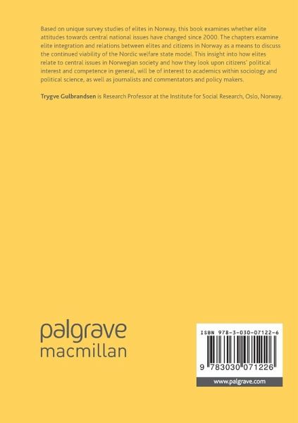 Based on two unique survey studies of elites in Norway, this book examines whether elite attitudes towards central national issues have changed in the wake of international and national events and developments since 2000. The chapters examine elite integration and relations between elites and citizens in Norway as a means to discuss the continued viability of the Nordic welfare state model. This insight into how elites relate to central issues in Norwegian society and how they look upon citizens' political interest and competence in general, will be of interest to academics within sociology and political science, as well as journalists and commentators and policy makers.