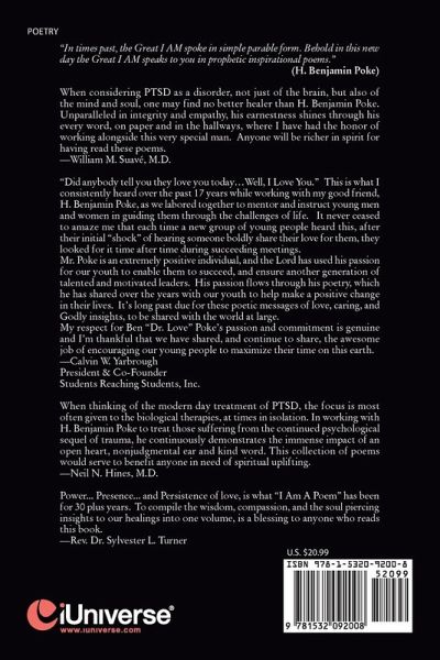 H. Benjamin Poke, a native of Petersburg, Virginia. is President, Poet and Founder of I Am A Poem, and "Elixir for Life" is a public servant, United States Air Force Vietnam Veteran and Ordained Minister. He is also a member of the International Society of Poets and has authored more than 300 prophetic inspirational poems.