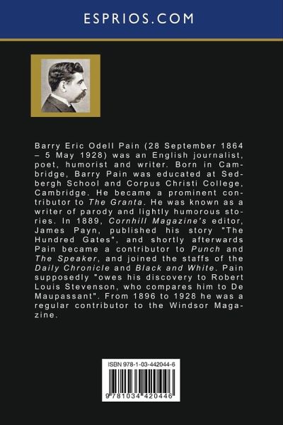 Barry Eric Odell Pain (28 September 1864 - 5 May 1928) was an English journalist, poet, humorist and writer. Born in Cambridge, Barry Pain was educated at Sedbergh School and Corpus Christi College, Cambridge. He became a prominent contributor to The Granta. He was known as a writer of parody and lightly humorous stories. In 1889, Cornhill Magazine's editor, James Payn, published his story "The Hundred Gates", and shortly afterwards Pain became a contributor to Punch and The Speaker, and joined the staffs of the Daily Chronicle and Black and White. Pain supposedly "owes his discovery to Robert Louis Stevenson, who compares him to De Maupassant". From 1896 to 1928 he was a regular contributor to the Windsor Magazine.