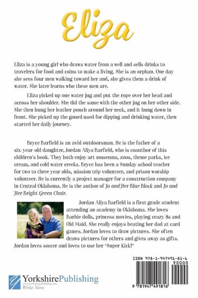 Eliza is a young girl who draws water from a well and sells drinks to travelers for food and coins to make a living. She is an orphan. One day she sees four men walking toward her and, she gives them a drink of water. She later learns who these men are. Eliza picked up one water jug and put the rope over her head and across her shoulder. She did the same with the other jug on her other side. She then hung her leather pouch around her neck, and it hung down in front. She picked up the gourd used for dipping and drinking water, then started her daily journey.