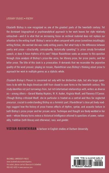 Elizabeth Bishop is now recognized as one of the greatest poets of the twentieth century-a uniquely cosmopolitan writer with connections to the US, Canada, Brazil, and also the UK, given her neglected borrowings from many English authors, and her strong influence on modern British verse. Yet the dominant biographical/psychoanalytical approach leaves her style relatively untouched-and it is vital that an increasing focus on archival material does not replace our attention to the writing itself. Bishop's verse is often compared with prose (sometimes insultingly); writing fiction, she worried she was really writing poems. But what truly is the difference between poetry and prose-structurally, conceptually, historically speaking? Is prose simply formalized speech, or does it have rhythms of its own? Ravinthiran seeks an answer to this question through close analysis of Bishop's prose-like verse, her literary prose, her prose poems, and her letter prose. This title is a provocation. It demands that we reconsider the pejorative quality of the word prosaic; playing on mosaic, Ravinthiran uses Bishop's thinking about prose to approach-for the first time-her work in multiple genres as a stylistic whole. Elizabeth Bishop's Prosaic is concerned not only with her inimitable style, but also larger questions to do with the Anglo-American shift from closed to open forms in the twentieth century. This study identifies not just borrowings from, but rich intertextual relationships with, writers as diverse as-among others-Gerard Manley Hopkins, W.H. Auden, Virginia Woolf, Flannery O'Connor, and Dorothy Richardson. (Though Bishop criticized Woolf, she in particular is treated as a central and thus far neglected precursor, crucial to our understanding of Bishop as a feminist poet.) Finally, the sustained discussion of how the history of prose frames effects of rhythm, syntax, and acoustic texture-in both Bishop's prose proper and her prosaic verse-extends a body of research which seeks now to treat literature as a form of cognition. Technique and thought are finely wedded in Bishop's work-her literary forms evince a historical intelligence attuned to questions of power, nationality, tradition (both literary and otherwise), race, and gender.
