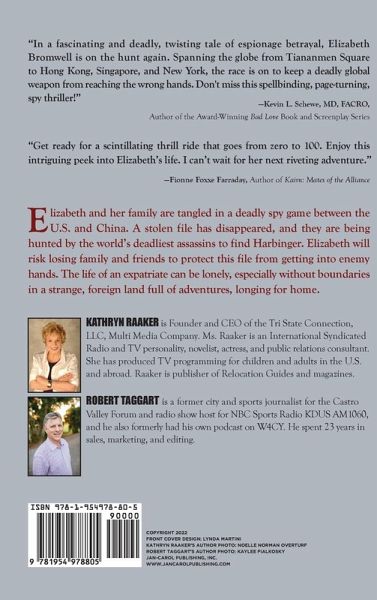 Elizabeth and her family are tangled in a deadly spy game between the U.S. and China. A stolen file has disappeared, and they are being hunted by the world's deadliest assassins to find Harbinger. Elizabeth will risk losing family and friends to protect this file from getting into enemy hands. The life of an expatriate can be lonely, especially without boundaries in a strange, foreign land full of adventures, longing for home. Exciting, adventurous, and full of twists and turns.