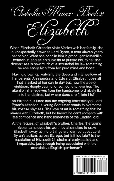When innocence and scoundrel collide... When Elizabeth Chisholm visits Venice with her family, she is unexpectedly drawn to Lord Byron - a man eleven years her senior. What she sees him present to her is grace, gentlemanlike behaviour, and an enthusiasm to pursue her. What she doesn't see is how much of a scoundrel he is - something he can easily hide from a mind and a heart as pure as hers. Having grown up watching the deep and intense love of her parents - Alessandra and Edward - Elizabeth does all that is asked of her day to day but, now the age of eighteen, deeply yearns for someone to love her. The attention she receives from the handsome lord nicely fits into her desires, but where does she fit into his? As Elizabeth is lured into the ongoing uncertainty of Lord Byron's attention, a young Scotsman wants to overcome his intense shyness. The love of art is something that he shares with Elizabeth, but he knows he can't compete with the extreme confidence and handsomeness of the English lord. At the request of Elizabeth's brother, Charles, the young Scotsman proves his worth by attempting to draw Elizabeth away as more things are learned about Lord Byron's actions across Europe, but is it too late? Is the reputation of Elizabeth Chisholm already sealed and irreparable, just through being associated with the scandalous English gentleman?