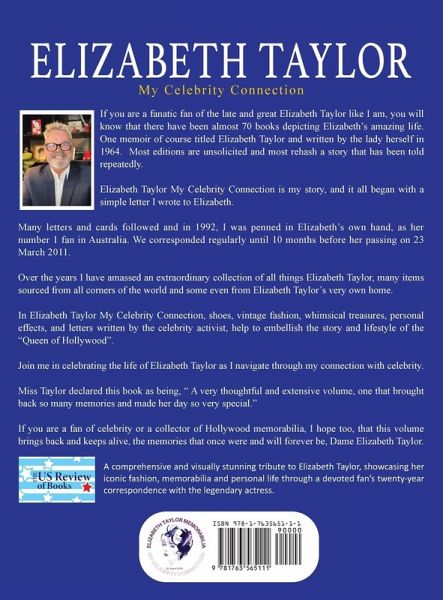 If you are a fanatic fan of the late and great Elizabeth Taylor like I am, you will know that there have been almost 70 books depicting Elizabeth's amazing life. One memoir of course titled Elizabeth Taylor and written by the lady herself in 1964. Most editions are unsolicited and most rehash a story that has been told repeatedly. Elizabeth Taylor My Celebrity Connection is my story, and it all began with a simple letter I wrote to Elizabeth. Many letters and cards followed and in 1992, I was penned in Elizabeth's own hand, as her number 1 fan in Australia. We corresponded regularly until 10…mehr