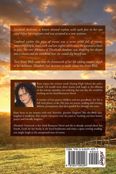 Elizabeth Anderson, a brown skinned orphan with stark fear in her eyes stood before her employers and was accepted as a new waitress.Confined within this place of unease was a secret world full of travels, interesting people, hard work and late nights; all because she possessed a heart to give. The core dilemma of Elizabeth's kindness was dropping her deeper into a chasm and she wondered how she would dig herself out.Then Ernie Wells came into the framework of her life adding another depth to her delimnas. Elizabeth had decisions to make about this Ernie Wells. Rane enjoys the written word. During High School she and a friend, Val would write short stories and laugh at the silliness of the written episodes; not realizing that one day she would be working on her third Romance Novel.A mother of four grown children and one grandbaby, her life is full with plenty to do. Her joys are prayer, reading and writing, definite prerequisites that have guided her through the years.Rane loves to see women with real, heartfelt, genuine laughter; like the Bible says, laughter is medicine. Her simple viewpoint over the years is "nothing can beat honest prayer and friendly laughter."Elizabeth Uncovered, is her third Romance Novel and she is already excited about her fourth. Look for her books at the local bookstores and enjoy a quiet evening reading; you might laugh at the unexpected turn of events.