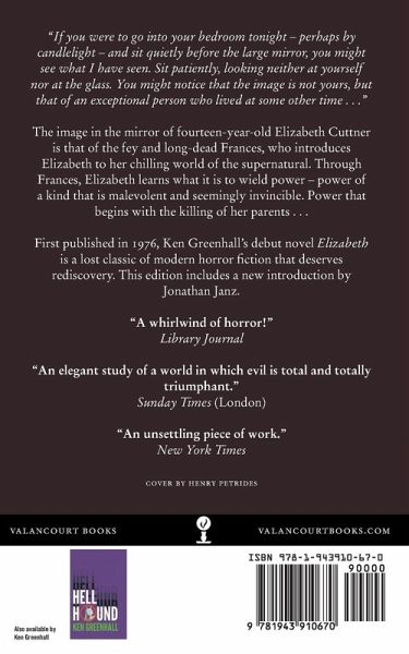 "If you were to go into your bedroom tonight - perhaps by candlelight - and sit quietly before the large mirror, you might see what I have seen. Sit patiently, looking neither at yourself nor at the glass. You might notice that the image is not yours, but that of an exceptional person who lived at some other time¿.¿.¿." The image in the mirror of fourteen-year-old Elizabeth Cuttner is that of the fey and long-dead Frances, who introduces Elizabeth to her chilling world of the supernatural. Through Frances, Elizabeth learns what it is to wield power - power of a kind that is malevolent and seemingly invincible. Power that begins with the killing of her parents . . . First published in 1976, Ken Greenhall's debut novel Elizabeth is a lost classic of modern horror fiction that deserves rediscovery. This edition includes a new introduction by Jonathan Janz. "A whirlwind of horror!" - Library Journal "An elegant study of a world in which evil is total and totally triumphant." - Sunday Times (London) "An unsettling piece of work." - New York Times