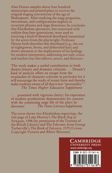 Alan Dessert samples about four hundred manuscripts and printed plays to record the original staging conventions of the age of Shakespeare. After studying the stage properties, movements and configurations implicit in recurrent phrases and stage directions, he concludes that Elizabethan spectators, less concerned with realism than later generations, were used to receiving a kind of theatrical shorthand transmitted by the actors from the playwright. Professor Dessert both describes this shorthand (e.g. the use of nightgowns, boots and dishevelled hair) and draws attention to the implications of his findings for modern interpreters, addressing not only critics and teachers but also editors, actors and directors.
