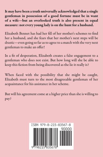 It may have been a truth universally acknowledged that a single gentleman in possession of a good fortune must be in want of a wife-but an overlooked truth is also present in equal measure: not every young lady is on the hunt for a husband. Elizabeth Bennet has had her fill of her mother's schemes to find her a husband, and she fears that her mother's next steps will be drastic-even going so far as to agree to a match with the very next gentleman to make an offer! In a fit of desperation, Elizabeth creates a false engagement to a gentleman who does not exist. But how long will she be able to keep this fiction from being discovered as the lie it really is? When faced with the possibility that she might be caught, Elizabeth must turn to the most disagreeable gentleman of her acquaintance for his assistance in her scheme. But will his agreement come at a higher price than she is willing to pay? Elizabeth's False Fiancé is a sweet, clean Regency romance that is suitable for all lovers of Jane Austen's romantic classic.
