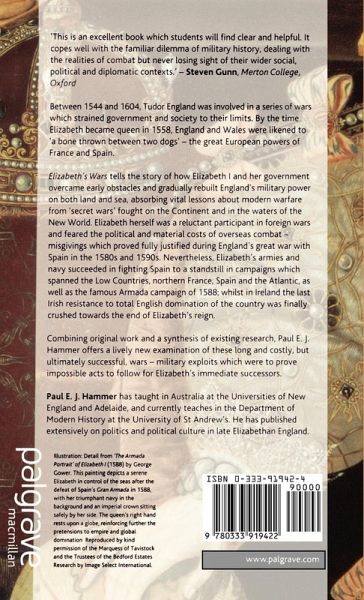 Between 1544 and 1604, Tudor England was involved in a series of wars which strained government and society to their limits. By the time Elizabeth became queen in 1558, England and Wales were likened to 'a bone thrown between two dogs' - the great European powers of France and Spain. Elizabeth's Wars tells the story of how Elizabeth I and her government overcame early obstacles and gradually rebuilt England's military power on both land and sea, absorbing vital lessons about modern warfare from 'secret wars' fought on the Continent and in the waters of the New World. Elizabeth herself was a reluctant participant in foreign wars and feared the political and material costs of overseas combat - misgivings which proved fully justified during England's great war with Spain in the 1580s and '90s. Nevertheless, Elizabeth's armies and navy succeeded in fighting Spain to a standstill in campaigns which spanned the Low Countries, northern France, Spain and the Atlantic, as well as the famous Armada campaign of 1588; whilst in Ireland the last Irish resistance to total English domination of the country was finally crushed towards the end of Elizabeth's reign. Combining original work and a synthesis of existing research, Paul E.J. Hammer offers a lively new examination of these long and costly, but ultimately successful, wars - military exploits which were to prove impossible acts to follow for Elizabeth's immediate successors.
