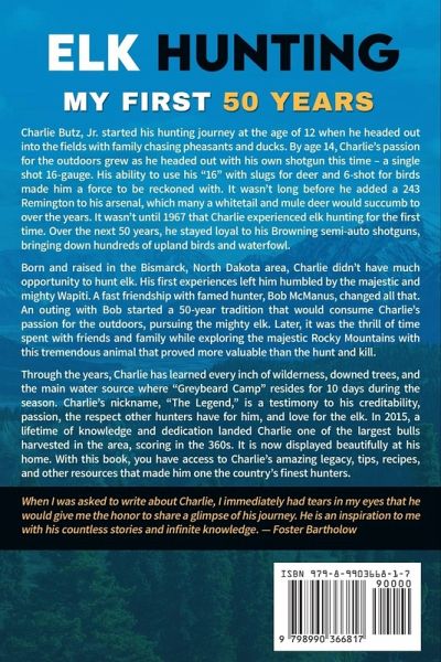 Charlie Butz, Jr. started his hunting journey at the age of 12 when he headed out into the fields with family chasing pheasants and ducks. By age 14, Charlie's passion for the outdoors grew as he headed out with his own shotgun this time - a single shot 16-gauge. His ability to use his "16" with slugs for deer and 6-shot for birds made him a force to be reckoned with. It wasn't long before he added a 243 Remington to his arsenal, which many a whitetail and mule deer would succumb to over the years. It wasn't until 1967 that Charlie experienced elk hunting for the first time. Over the next 50 years, he stayed loyal to his Browning semi-auto shotguns, bringing down hundreds of upland birds and waterfowl. Born and raised in the Bismarck, North Dakota area, Charlie didn't have much opportunity to hunt elk. His first experiences left him humbled by the majestic and mighty Wapiti. A fast friendship with famed hunter, Bob McManus changed all that. An outing with Bob started a 50-year tradition that would consume Charlie's passion for the outdoors, pursuing the mighty elk. Later, it was the thrill of time spent with friends and family while exploring the majestic Rocky Mountains with this tremendous animal that proved more valuable than the hunt and kill. Through the years, Charlie has learned every inch of wilderness, downed trees, and the main water source where "Greybeard Camp" resides for 10 days during the season. Charlie's nickname, "The Legend," is a testimony to his creditability, passion, the respect other hunters have for him, and love for the elk. In 2015, a lifetime of knowledge and dedication landed Charlie one of the largest bulls harvested in the area, scoring in the 360s. It is now displayed beautifully at his home. With this book, you have access to Charlie's amazing legacy, tips, recipes, and other resources that made him one the country's finest hunters.