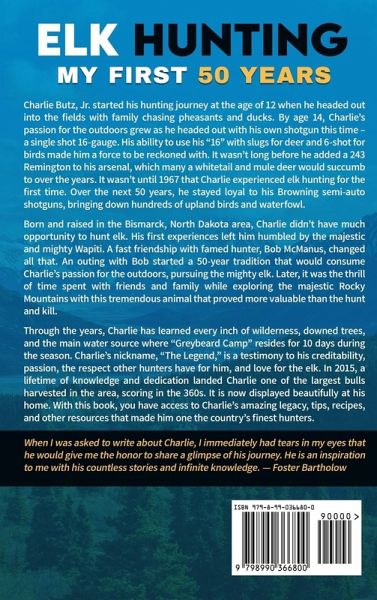 Charlie Butz, Jr. started his hunting journey at the age of 12 when he headed out into the fields with family chasing pheasants and ducks. By age 14, Charlie's passion for the outdoors grew as he headed out with his own shotgun this time - a single shot 16-gauge. His ability to use his "16" with slugs for deer and 6-shot for birds made him a force to be reckoned with. It wasn't long before he added a 243 Remington to his arsenal, which many a whitetail and mule deer would succumb to over the years. It wasn't until 1967 that Charlie experienced elk hunting for the first time. Over the next 50 years, he stayed loyal to his Browning semi-auto shotguns, bringing down hundreds of upland birds and waterfowl. Born and raised in the Bismarck, North Dakota area, Charlie didn't have much opportunity to hunt elk. His first experiences left him humbled by the majestic and mighty Wapiti. A fast friendship with famed hunter, Bob McManus changed all that. An outing with Bob started a 50-year tradition that would consume Charlie's passion for the outdoors, pursuing the mighty elk. Later, it was the thrill of time spent with friends and family while exploring the majestic Rocky Mountains with this tremendous animal that proved more valuable than the hunt and kill. Through the years, Charlie has learned every inch of wilderness, downed trees, and the main water source where "Greybeard Camp" resides for 10 days during the season. Charlie's nickname, "The Legend," is a testimony to his creditability, passion, the respect other hunters have for him, and love for the elk. In 2015, a lifetime of knowledge and dedication landed Charlie one of the largest bulls harvested in the area, scoring in the 360s. It is now displayed beautifully at his home. With this book, you have access to Charlie's amazing legacy, tips, recipes, and other resources that made him one the country's finest hunters.