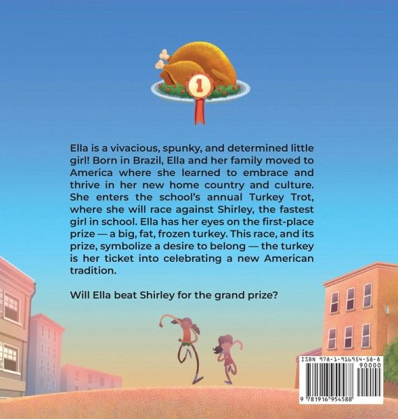 Ella is a vivacious, spunky, and determined little girl! Born in Brazil, Ella and her family moved to America where she learned to embrace and thrive in her new home country and culture. She enters the school's annual Turkey Trot, where she will race against Shirley, the fastest girl in school. Ella has her eyes on the first-place prize - a big, fat, frozen turkey. This race, and its prize, symbolize a desire to belong - the turkey is her ticket into celebrating a new American tradition. Will Ella beat Shirley for the grand prize?