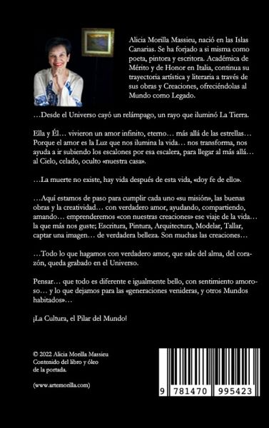 ...Desde el Universo cayó un relámpago, un rayo que iluminó La Tierra. Ella y Él... vivieron un amor infinito, eterno... más allá de las estrellas... Porque el amor es la Luz que nos ilumina la vida... nos transforma, nos ayuda a ir subiendo los escalones por esa escalera, para llegar al más allá... al Cielo, celado, oculto nuestra casa. ...La muerte no existe, hay vida después de esta vida, doy fe de ello. ...Aquí estamos de paso para cumplir cada uno su misión, las buenas obras y la creatividad... con verdadero amor, ayudando, compartiendo, amando... emprenderemos con nuestras creaciones ese viaje de la vida... la que más nos guste; Escritura, Pintura, Arquitectura, Modelar, Tallar, captar una imagen... de verdadera belleza. Son muchas las creaciones... ...Todo lo que hagamos con verdadero amor, que sale del alma, del corazón, queda grabado en el Universo. Pensar... que todo es diferente e igualmente bello, con sentimiento amoroso... y lo que dejamos para las generaciones venideras, y otros Mundos habitados... ¡La Cultura, el Pilar del Mundo! ...Seguiré escribiendo mis poemas, versos, poesías... pintando, modelando... ayudando, amando... a todos los seres del Mundo y del Universo, defendiendo nuestros derechos... La pluma puede más que la espada. ...Después, despacio y en silencio... me iré... cuando llegue el momento, donde la Luz nunca se apaga... su resplandor es felicidad, y el amor es eterno, infinito... ...Esa es nuestra verdadera casa, la morada de Dios, que nos abre sus brazos, para recibirnos, con una gran sonrisa nos da la bienvenida... Con muchísimo amor... aquí en este libro... está el amor verdadero, el que nunca se apaga... como una antorcha encendida y continua... ¡Anda! ¡Dame la mano!... Será esta historia de Otro Mundo, de Otra Galaxia, de vidas pasadas... de esta... ...Será, será... solo ellos lo saben. Grupo Artemorilla www.artemorilla.com