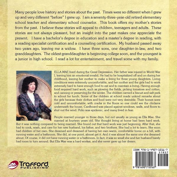This book discusses memoirs from my mother as she grew up and lived before, during, and after the Great Depression. It details some of her experiences. She was from a very poor background educationally and financially, like many people were during those days. It discusses her poor living conditions, her discomforts, and how she lacked any of the conveniences that one has today. It details how hard people had to work at that time and how she persevered to the end-ever, ever struggling to reach her goal of a permanent home. Some of the types of working conditions are described: how difficult it was to get a job that paid enough to live, how hard it was to keep enough food to eat, and how uncomfortable their living conditions were. The homes were poorly built and drafty. It emphasizes the struggle to get rid of lice since they seemed to be everywhere, and just the difficulty to keep warm during winter since there was no central heat or air- conditioning. It discusses her father going to World War I and his war conditions and hazards, such as body lice, gases, death, and not having enough to eat. Then, her husband was drafted into World War II. It touches on the polio epidemic and hospital conditions. It tells how she scrimped and saved unendingly to finally reach her goal of a permanent, warm, and comfortable home. Young people will see a great deal of contrast between living conditions then and now.