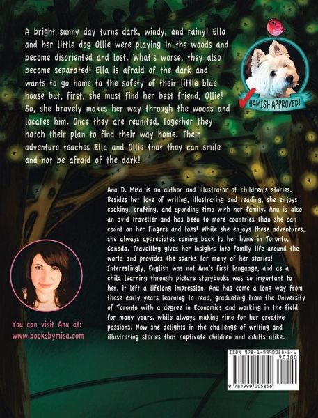 This Royal Dragonfly Award Winner is the first book in the Ella Says adventure series and tells the delightful tale of a brave girl named Ella, who puts aside her fear of the dark to help her best friend, Ollie, and find her way home. Check out the whole series! The weather suddenly changes, and a bright sunny day turns DARK, windy, and rainy! Ella and her little dog Ollie, who were playing, become disoriented and LOST in the woods. Ella could no longer tell which direction was North, South, East, or West-none of the compass points. Ella and Ollie also become separated. Ella is AFRAID of the dark and wants to go home to their little blue house, but, first, she must find her best friend, Ollie! She BRAVELY makes her way through the dark woods and finds him! Once they are reunited, together with many woodland friends, they hatch their plan to find their way home. Their ADVENTURE teaches Ella and Ollie that they can smile and not be afraid of the dark! A picture storybook that delivers an ENTERTAINING tale with stunning illustrations on every page. FREEBIE surprises available on the author's website! Wonderful way to INSPIRE CHATS about not being afraid of the dark, the importance of managing change, and working together through team work to solve problems. Great for young readers and as a bedtime story for younger children.