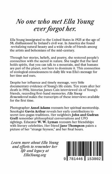 No one who met Ella Young ever forgot her. Ella Young immigrated to the United States in 1925 at the age of 58, disillusioned by Ireland's civil war. In America she found a revitalizing natural beauty and a wide circle of friends among the artists and bohemians of the mid-century. Through her stories, beliefs, and poetry, she restored people's connection with the sacred in nature. She taught that the land holds spirits, that you can talk to a mountain, and that humans are part of the planet, not here to dominate it. This connection of ecological consciousness to daily life was Ella's wisdom for her time and ours. Despite her influence and timely message, very little documentary evidence of Young's life exists. Ten years after her death in 1956, historian James Cain interviewed six of Young's friends, recording first-hand memories. Ella Young Remembered makes the transcripts of these interviews available for the first time. Photographer Ansel Adams recounts her spiritual mentorship. Sexologist Gavin Arthur reveals her early contributions to secret neo-pagan traditions. Her neighbors John and Gudrun Grell remember philosophical conversations and UFO sightings. Educator W. W. Lyman recounts her friendships with literary and bohemian celebrities. Her friend Jane Thompson paints a picture of her "strange feyness," and her final hours.