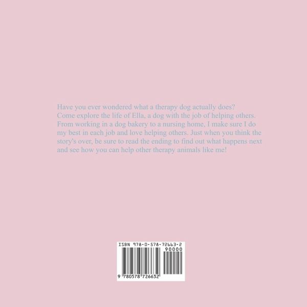 Have you ever wondered what a therapy dog actually does? Come explore the life of Ella, a dog with the job of helping others. From working in a dog bakery to a nursing home, I make sure I do my best in each job and love helping others. Just when you think the story's over, be sure to read the ending to find out what happens next and see how you can help other therapy animals like me!