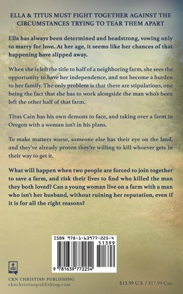 Ella has always been determined and headstrong, vowing only to marry for love. At her age, it seems like her chances of that happening have slipped away. When she is left the title to half of a neighboring farm, she sees the opportunity to have her independence, and not become a burden to her family. The only problem is that there are stipulations, one being the fact that she has to work alongside the man who's been left the other half of that farm. Titus Cain has his own demons to face, and taking over a farm in Oregon with a woman isn't in his plans. To make matters worse, someone else has their eye on the land, and they've already proven they're willing to kill whoever gets in their way to get it. What will happen when two people are forced to join together to save a farm, and risk their lives to find who killed the man they both loved? Can a young woman live on a farm with a man who isn't her husband, without ruining her reputation, even if it is for all the right reasons? Ella & Titus must fight together against the circumstances trying to tear them apart.