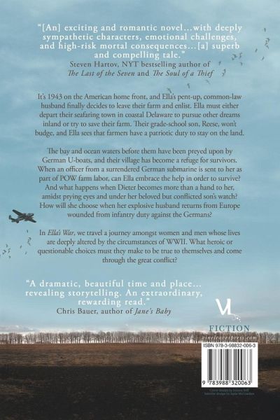 It's 1943 on the American home front, and Ella's pent-up, common-law husband finally decides to leave their farm and enlist. Ella must either depart their seafaring town in coastal Delaware to pursue other dreams inland or try to save their farm. Their grade-school son, Reese, won't budge, and Ella sees that farmers have a patriotic duty to stay on the land. The bay and ocean waters before them have been preyed upon by German U-boats, and their village has become a refuge for survivors. When an officer from a surrendered German submarine is sent to her as part of POW farm labor, can Ella embrace the help in order to survive? And what happens when Dieter becomes more than a hand to her, amidst prying eyes and under her beloved but conflicted son's watch? How will she choose when her explosive husband returns from Europe wounded from infantry duty against the Germans? In Ella's War, we travel a journey amongst women and men whose lives are deeply altered by the circumstances of WWII. What heroic or questionable choices must they make to be true to themselves and come through the great conflict?