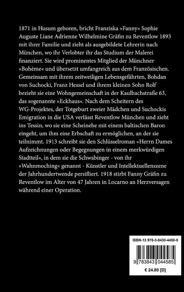 1871 in Husum geboren, bricht Franziska "Fanny" Sophie Auguste Liane Adrienne Wilhelmine Gräfin zu Reventlow 1893 mit ihrer Familie und zieht als ausgebildete Lehrerin nach München, wo ihr Verlobter ihr das Studium der Malerei finanziert. Sie wird prominentes Mitglied der Münchner "Bohème" und übersetzt umfangreich aus dem Französischen. Gemeinsam mit ihrem zeitweiligen Lebensgefährten, Bohdan von Suchocki, Franz Hessel und ihrem kleinen Sohn Rolf bezieht sie eine Wohngemeinschaft in der Kaulbachstraße 63, das sogenannte "Eckhaus". Nach dem Scheitern des WG-Projektes, der Totgeburt zweier Mädchen und Suchockis Emigration in die USA verlässt Reventlow München und zieht ins Tessin, wo sie eine Scheinehe mit einem baltischen Baron eingeht, um ihm eine Erbschaft zu ermöglichen, an der sie teilnimmt. 1913 schreibt sie den Schlüsselroman "Herrn Dames Aufzeichnungen oder Begegnungen in einem merkwürdigen Stadtteil", in dem sie die Schwabinger - von ihr "Wahnmoching" genannt - Künstler und Intellektuellenszene der Jahrhundertwende persifliert. 1918 stirbt Fanny Gräfin zu Reventlow im Alter von 47 Jahren in Locarno an Herzversagen während einer Operation.