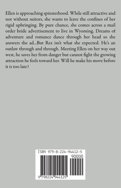 Ellen is approaching spinsterhood. While still attractive and not without suitors, she wants to leave the confines of her rigid upbringing. By pure chance, she comes across a mail order bride advertisement to live in Wyoming. Dreams of adventure and romance dance through her head so she answers the ad...But Rex isn't what she expected. He's an outlaw through and through. Meeting Ellen on her way out west, he saves her from danger but cannot fight the growing attraction he feels toward her. Will he make his move before it is too late?