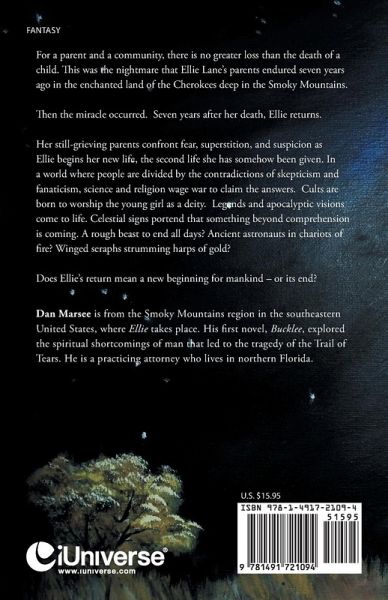 For a parent and a community, there is no greater loss than the death of a child. This was the nightmare that Ellie Lane's parents endured seven years ago in the enchanted land of the Cherokees deep in the Smoky Mountains. Then the miracle occurred. Seven years after her death, Ellie returns. Her still-grieving parents confront fear, superstition, and suspicion as Ellie begins her new life, the second life she has somehow been given. In a world where people are divided by the contradictions of skepticism and fanaticism, science and religion wage war to claim the answers. Cults are born to worship the young girl as a deity. Legends and apocalyptic visions come to life. Celestial signs portend that something beyond comprehension is coming. A rough beast to end all days? Ancient astronauts in chariots of fire? Winged seraphs strumming harps of gold? Does Ellie's return mean a new beginning for mankind - or its end?