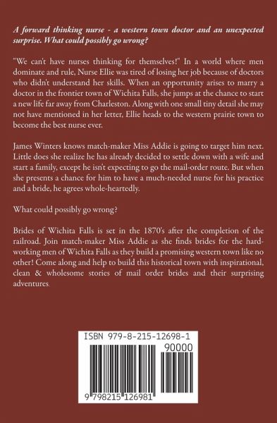 A forward thinking nurse - a western town doctor and an unexpected surprise. What could possibly go wrong? "We can't have nurses thinking for themselves!" In a world where men dominate and rule, Nurse Ellie was tired of losing her job because of doctors who didn't understand her skills. When an opportunity arises to marry a doctor in the frontier town of Wichita Falls, she jumps at the chance to start a new life far away from Charleston. Along with one small tiny detail she may not have mentioned in her letter, Ellie heads to the western prairie town to become the best nurse ever. James Winters knows match-maker Miss Addie is going to target him next. Little does she realize he has already decided to settle down with a wife and start a family, except he isn't expecting to go the mail-order route. But when she presents a chance for him to have a much-needed nurse for his practice and a bride, he agrees whole-heartedly. What could possibly go wrong? Brides of Wichita Falls is set in the 1870's after the completion of the railroad. Join match-maker Miss Addie as she finds brides for the hard-working men of Wichita Falls as they build a promising western town like no other! Come along and help to build this historical town with inspirational, clean & wholesome stories of mail order brides and their surprising adventures.