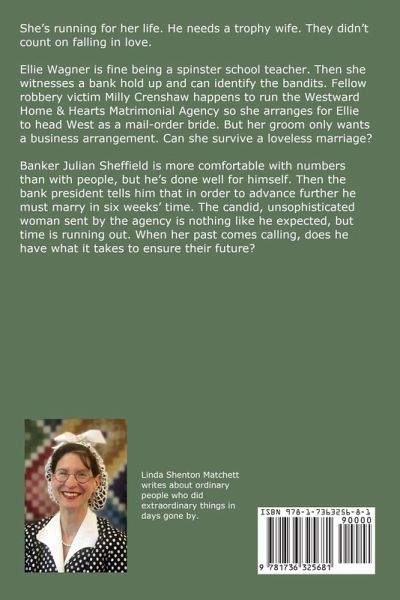 She's running for her life. He needs a trophy wife. They didn't count on falling in love. Ellie Wagner is fine being a spinster school teacher. Then she witnesses a bank hold up and can identify the bandits. Fellow robbery victim Milly Crenshaw happens to run the Westward Home & Hearts Matrimonial Agency so she arranges for Ellie to head West as a mail-order bride. But her groom only wants a business arrangement. Can she survive a loveless marriage? Banker Julian Sheffield is more comfortable with numbers than with people, but he's done well for himself. Then the bank president tells him that in order to advance further he must marry in six weeks' time. The candid, unsophisticated woman sent by the agency is nothing like he expected, but time is running out. When her past comes calling, does he have what it takes to ensure their future?