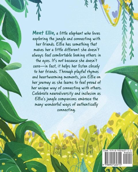 Meet Ellie, a little elephant who loves exploring the jungle and connecting with her friends. Ellie has something that makes her a little different: she doesn't always feel comfortable looking others in the eyes. It's not because she doesn't care-in fact, it helps her listen closely to her friends. Through playful rhymes and heartwarming moments, join Ellie on her journey as she learns to feel proud of her unique way of connecting with others. Celebrate neurodiversity and inclusion as Ellie's jungle companions embrace the many wonderful ways of connecting. Written by pediatric speech-language pathologist Caitlin Downie, this story draws from real experiences to help children, parents, and educators embrace the beautiful diversity of human connection. Perfect for preschool and school-aged children, "Ellie's Way" opens important conversations about: ¿ Accepting and celebrating different ways of being ¿ Understanding that eye contact isn't the only way to show attention ¿ Building confidence in our own unique ways of connecting ¿ Fostering inclusivity and understanding in young minds