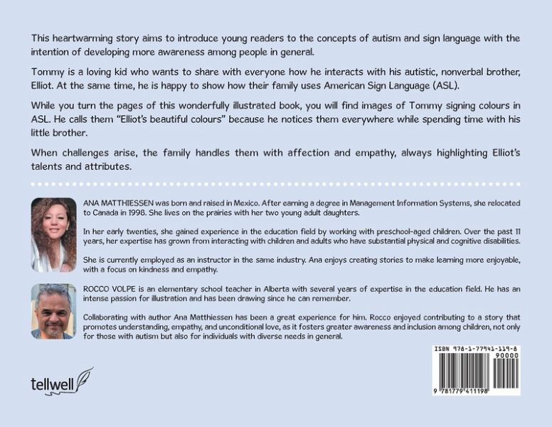 This heartwarming story aims to introduce young readers to the concepts of autism and sign language with the intention of developing more awareness among people in general. Tommy is a loving kid who wants to share with everyone how he interacts with his autistic, nonverbal brother, Elliot. At the same time, he is happy to show how their family uses American Sign Language (ASL). While you turn the pages of this wonderfully illustrated book, you will find images of Tommy signing colours in ASL. He calls them "Elliot's beautiful colours" because he notices them everywhere while spending time with his little brother. When challenges arise, the family handles them with affection and empathy, always highlighting Elliot's talents and attributes.