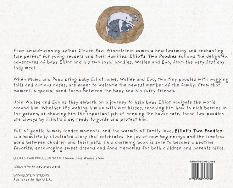 Welcome to a heartwarming and enchanting tale perfect for young readers and their families. "Elliot's Two Poodles" follows the delightful adventures of baby Elliot and his two loyal poodles, Wallee and Evo, from the very first day they meet. When Mama and Papa bring baby Elliot home, Wallee and Evo, two tiny poodles with wagging tails and curious noses, are eager to welcome the newest member of the family. From that moment, a special bond forms between the baby and his furry friends. Join Wallee and Evo as they embark on a journey to help baby Elliot navigate the world around him. Whether it's waking him up with wet kisses, teaching him how to pick berries in the garden, or showing him the important job of keeping the house safe, these two poodles are always by Elliot's side, ready to guide and protect him. Full of gentle humor, tender moments, and the warmth of family love, "Elliot's Two Poodles" is a beautifully illustrated story that celebrates the joy of new beginnings and the timeless bond between children and their pets. This charming book is sure to become a bedtime favorite, encouraging sweet dreams and fond memories for both children and parents alike.