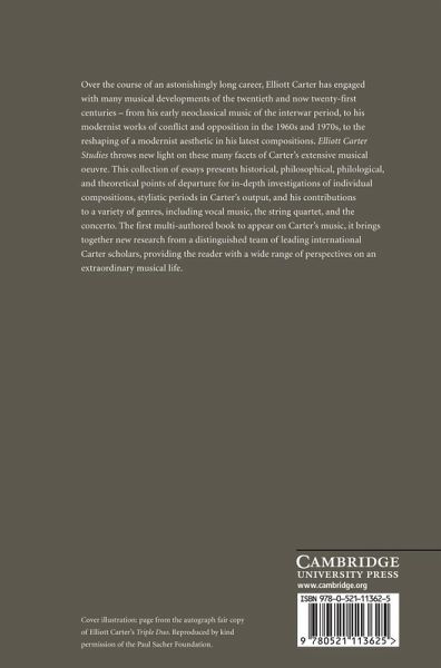 Over the course of an astonishingly long career, Elliott Carter has engaged with many musical developments of the twentieth and now twenty-first centuries - from his early neo-classic music of the interwar period, to his modernist works of conflict and opposition in the 1960s and 1970s, to the reshaping of a modernist aesthetic in his latest compositions. Elliott Carter Studies throws new light on these many facets of Carter's extensive musical oeuvre. This collection of essays presents historic, philosophic, philological and theoretical points of departure for in-depth investigations of individual compositions, stylistic periods in Carter's output and his contributions to a variety of genres, including vocal music, the string quartet and the concerto. The first multi-authored book to appear on Carter's music, it brings together research from a distinguished team of leading international Carter scholars, providing the reader with a wide range of perspectives on an extraordinary musical life.