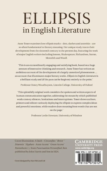 Anne Toner provides an original account of the history of ellipsis marks - dots, dashes and asterisks - in English literary writing. Highlighting ever-renewing interest in these forms of non-completion in literature, Toner demonstrates how writers have striven to get closer to the hesitancies and interruptions of spoken language, the indeterminacies of thought, and the successive or fragmented nature of experience by means of these textual symbols. While such punctuation marks may seem routine today, this book describes their emergence in early modern drama and examines the relationship between authors, printers and grammarians in advancing or obstructing the standardisation of the marks. Their development is explored through close study of the works of major English writers, including Jonson, Shakespeare, Richardson, Sterne, Meredith and Woolf, along with visual illustrations of their usage. In particular, Toner traces the evolution of ellipsis marks in the novel, a form highly receptive to elliptical punctuation.