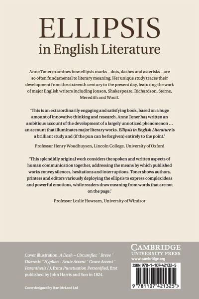 Anne Toner provides an original account of the history of ellipsis marks - dots, dashes and asterisks - in English literary writing. Highlighting ever-renewing interest in these forms of non-completion in literature, Toner demonstrates how writers have striven to get closer to the hesitancies and interruptions of spoken language, the indeterminacies of thought, and the successive or fragmented nature of experience by means of these textual symbols. While such punctuation marks may seem routine today, this book describes their emergence in early modern drama and examines the relationship between authors, printers and grammarians in advancing or obstructing the standardisation of the marks. Their development is explored through close study of the works of major English writers, including Jonson, Shakespeare, Richardson, Sterne, Meredith and Woolf, along with visual illustrations of their usage. In particular, Toner traces the evolution of ellipsis marks in the novel, a form highly receptive to elliptical punctuation.