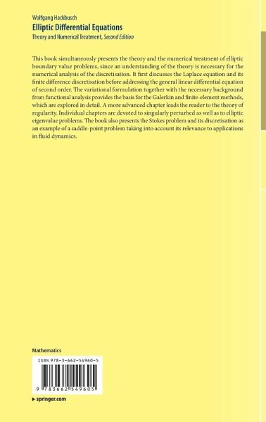 This book simultaneously presents the theory and the numerical treatment of elliptic boundary value problems, since an understanding of the theory is necessary for the numerical analysis of the discretisation. It first discusses the Laplace equation and its finite difference discretisation before addressing the general linear differential equation of second order. The variational formulation together with the necessary background from functional analysis provides the basis for the Galerkin and finite-element methods, which are explored in detail. A more advanced chapter leads the reader to the theory of regularity. Individual chapters are devoted to singularly perturbed as well as to elliptic eigenvalue problems. The book also presents the Stokes problem and its discretisation as an example of a saddle-point problem taking into account its relevance to applications in fluid dynamics.