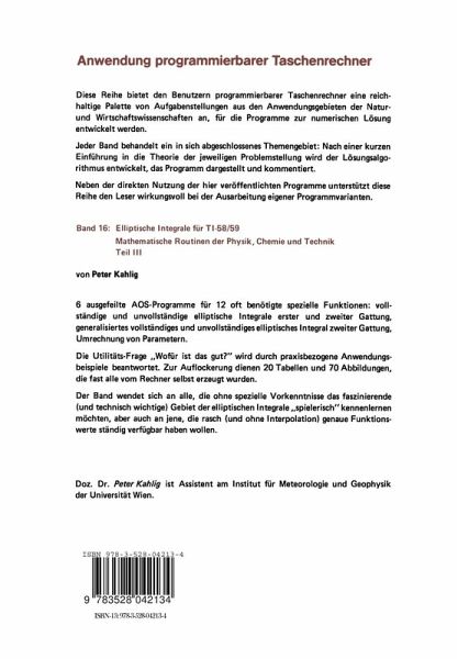 Der vorliegende Band beschiiftigt sich mit der Gewinnung von Zahlenwerten zu elliptischen Integralen erster und zweiter Gattung. Dies geschieht hier nicht mittels Tabellen und Interpolation, sondern durch geeignete Transformationen und numerische Approximationen. Die von Taschen rechnern erzielbare Genauigkeit liegt dabei relativ hoch (etwa 9 bis 10 Dezimalstellen). Die mit bescheidensten Mitteln hergestellten Abbildungen sind nicht uninteressant. Anwendungs beispiele illustrieren die wichtigsten Transformationen und schlagen eine Briicke zur technischen Praxis. 1m Anhang mitgeteilte Fehlerschranken bezeugen die Brauchbarkeit der Routinen. Ein Register, das die Verbindung zum Tafel-Index von Fletcher-Miller-Rosenhead herstellt, erleichtert einen Literaturvergleich. Natiirlich sind gro~e Computer sehr viel schneller, zugleich aber sehr viel aufwendiger. Zur prompten Berechnung einzelner Funktionswerte von elliptischen Integralen scheint der vorliegende Band jedenfalls einen gangbaren Weg zu weisen. Univ. Prof. Dr. Nikolaus Hofreiter, Institut fur Mathematik der Universitiit Wien. Korrespond. Mitglied der Osterr. Akademie der Wissenschaften. Koautor der Integraltafeln (Springer, Wien). VI Vorwort Dieses Buch ist als Soforthilfe fur die Praxis bestimmt: Oft benotigte spezielle Funktionen der Physik, Chemie und Technik stehen auf Knopfdruck bereit. Die standige Verfiigbarkeit von Taschenrechnern ist dabei ein gewisser Vorteil gegenuber Tabellenwerken oder GroBrechnern. Auch leisten Taschenrechner gute Dienste bei Test und Auswahl von okonomischen Algorithmen fur GroBrechner. - Die Idee zu diesem Buch geht auf Anregungen von Studenten der Naturwissen· schaften an der Universitiit Wien zuruck.