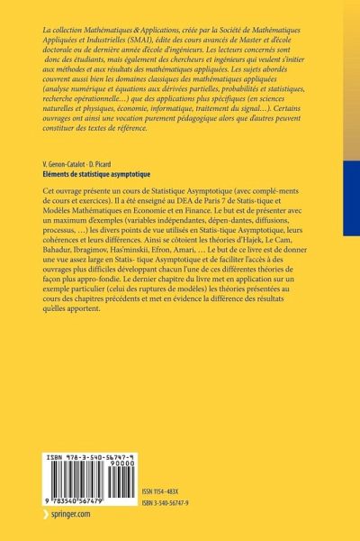 Cet ouvrage présente un cours de Statistique Asymptotique (avec compléments de cours et exercices). Il a été enseigné au DEA de Paris 7 de Statistique et Modèles Mathématiques en Economie et en Finance. Le but est de présenter avec un maximum d'exemples (variables indépendantes, dépendantes, diffusions, processus, ...) les divers points de vue utilisés en Statistique Asymptotique, leurs cohérences et leurs différences. Ainsi se côtoient les théories d'Hajek, Le Cam, Bahadur, Ibragimov, Has'minskii, Efron, Amari, ... Le but de ce livre est de donner une vue assez large en Statistique Asymptotique et de faciliter l'accès à des ouvrages plus difficiles développant chacun l'une de ces différentes théories de façon plus approfondie. Le dernier chapitre du livre met en application sur un exemple particulier (celui des ruptures de modèles) les théories présentées au cours des chapitres précédents et met en évidence la différence des résultats qu'elles apportent.