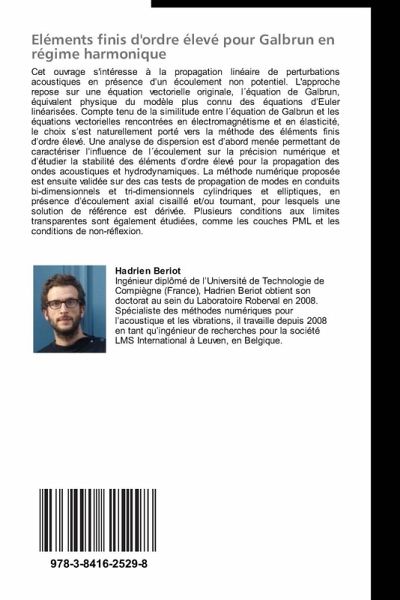 Cet ouvrage s'intéresse à la propagation linéaire de perturbations acoustiques en présence d un écoulement non potentiel. L'approche repose sur une équation vectorielle originale, l équation de Galbrun, équivalent physique du modèle plus connu des équations d Euler linéarisées. Compte tenu de la similitude entre l équation de Galbrun et les équations vectorielles rencontrées en électromagnétisme et en élasticité, le choix s est naturellement porté vers la méthode des éléments finis d ordre élevé. Une analyse de dispersion est d abord menée permettant de caractériser l influence de l écoulement sur la précision numérique et d étudier la stabilité des éléments d ordre élevé pour la propagation des ondes acoustiques et hydrodynamiques. La méthode numérique proposée est ensuite validée sur des cas tests de propagation de modes en conduits bi-dimensionnels et tri-dimensionnels cylindriques et elliptiques, en présence d écoulement axial cisaillé et/ou tournant, pour lesquels une solution de référence est dérivée. Plusieurs conditions aux limites transparentes sont également étudiées, comme les couches PML et les conditions de non-réflexion.