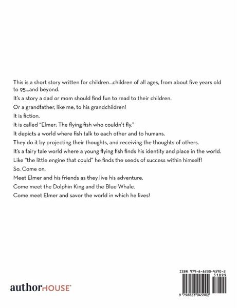 This is a short story written for children...children of all ages, from about five years old to 95...and beyond. It's a story a dad or mom should find fun to read to their children. Or a grandfather, like me, to his grandchildren! It is fiction. It is called "Elmer: The flying fish who couldn't fly." It depicts a world where fish talk to each other and to humans. They do it by projecting their thoughts, and receiving the thoughts of others. It's a fairy tale world where a young flying fish finds his identity and place in the world. Like "the little engine that could" he finds the seeds of success within himself! So. Come on. Meet Elmer and his friends as they live his adventure. Come meet the Dolphin King and the Blue Whale. Come meet Elmer and savor the world in which he lives!