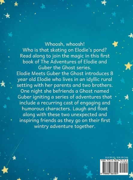 Whoosh, whoosh! Who is that skating on Elodie's pond? Read along to join the magic in this first book of The Adventures of Elodie and Guber the Ghost series. Elodie Meets Guber the Ghost introduces 8 year old Elodie who lives in an idyllic rural setting with her parents and two brothers. One night she befriends a Ghost named Guber igniting a series of adventures that include a recurring cast of engaging and humorous characters. Laugh and float along with these two unexpected and inspiring friends as they go on their first wintry adventure together.
